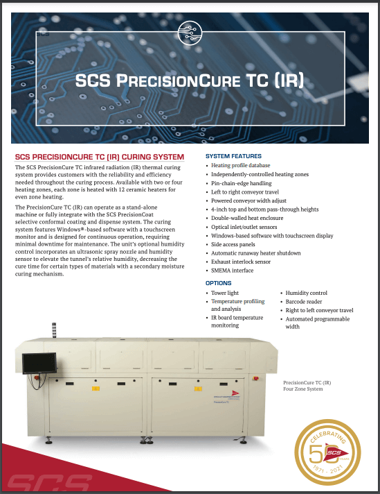 The SCS PrecisionCure TC infrared radiation (IR) thermal curing system is available with two or four heating zones. Each zone is heated with 12 ceramic heaters for even heating. The curing system can operate as a stand-alone machine or fully integrate with the SCS PrecisionCoat selective conformal coating and dispense system.